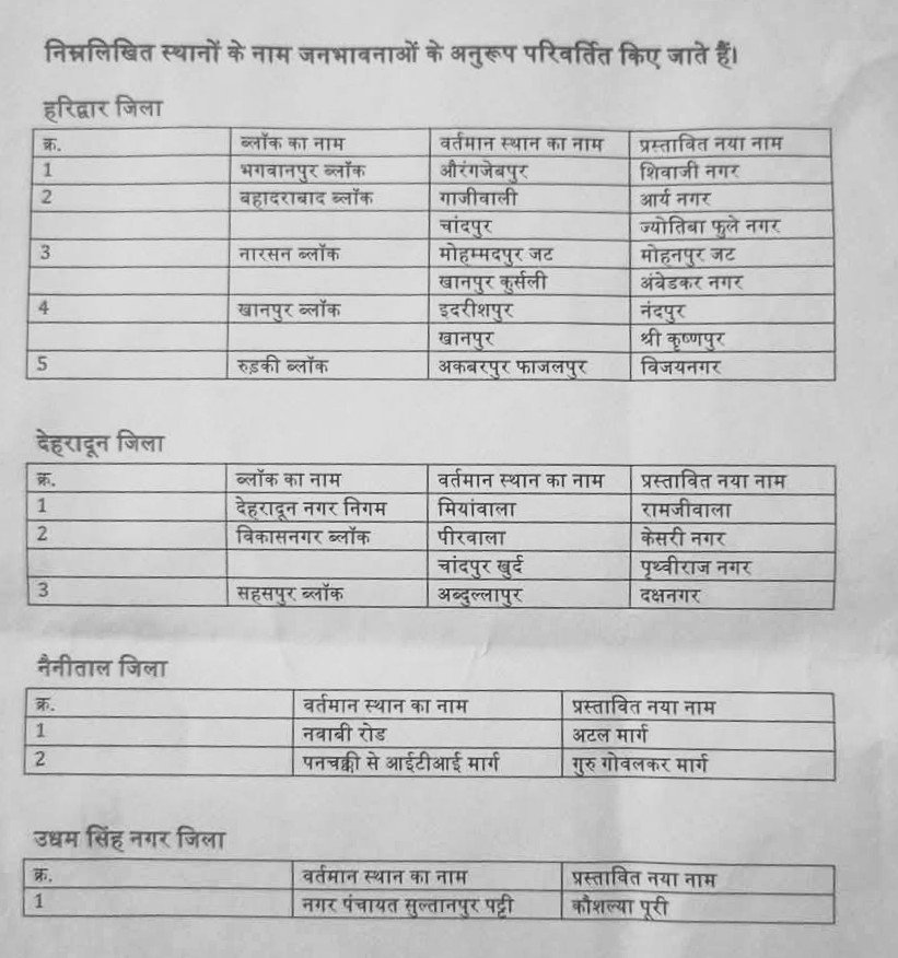 देहरादून(Uttarakhand News): उत्तराखंड के मुख्यमंत्री पुष्कर सिंह धामी ने सोमवार को राज्य के चार जिलों—हरिद्वार, देहरादून, नैनीताल और उधम सिंह नगर—में 15 स्थानों के नाम बदलने की घोषणा की। यह फैसला भारतीय संस्कृति और लोक भावना के अनुरूप लिया गया है।